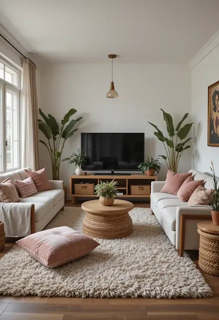 Comfort is key in a boho living room, so use soft, plush textures around your TV area for a cozy and inviting atmosphere.